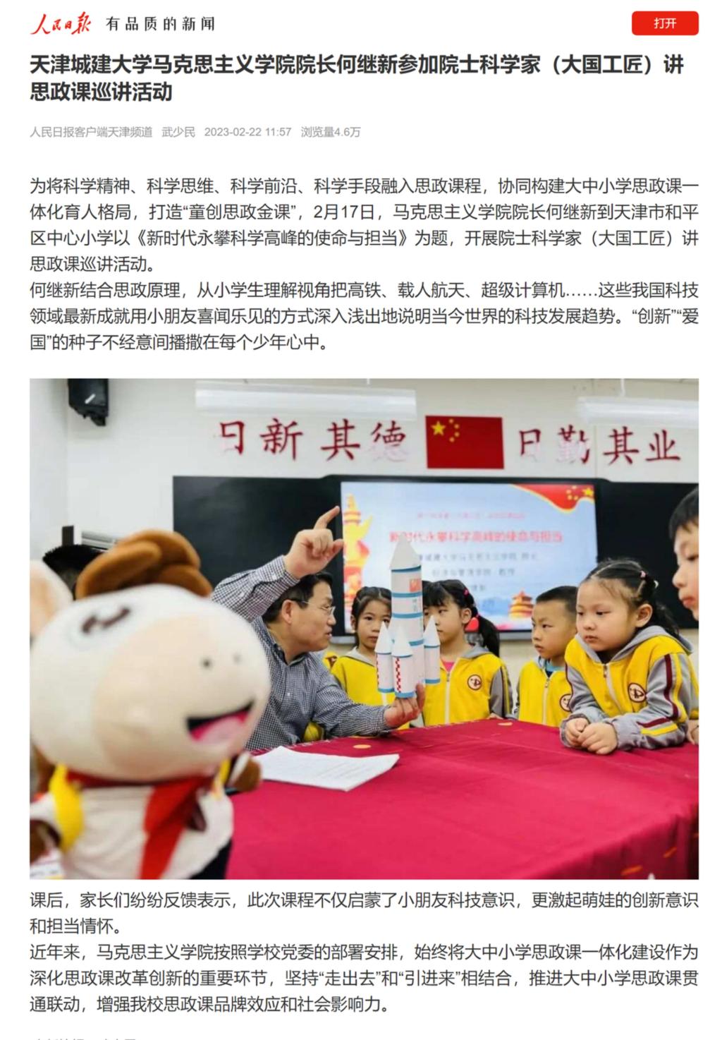 为将科学精神、科学思维、科学前沿、科学手段融入思政课程,协同构建大中小学思政课一体化育人格局,打造“童创思政金课”,2月17日,马克思主义学院院长何继新到天津市和平区中心小学以《新时代永攀科学高峰的使命与担当》为题,开展院士科学家(大国工匠)讲思政课巡讲活动。
