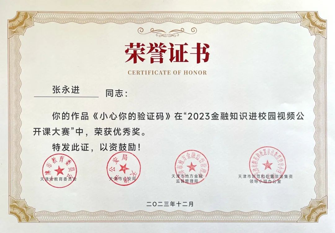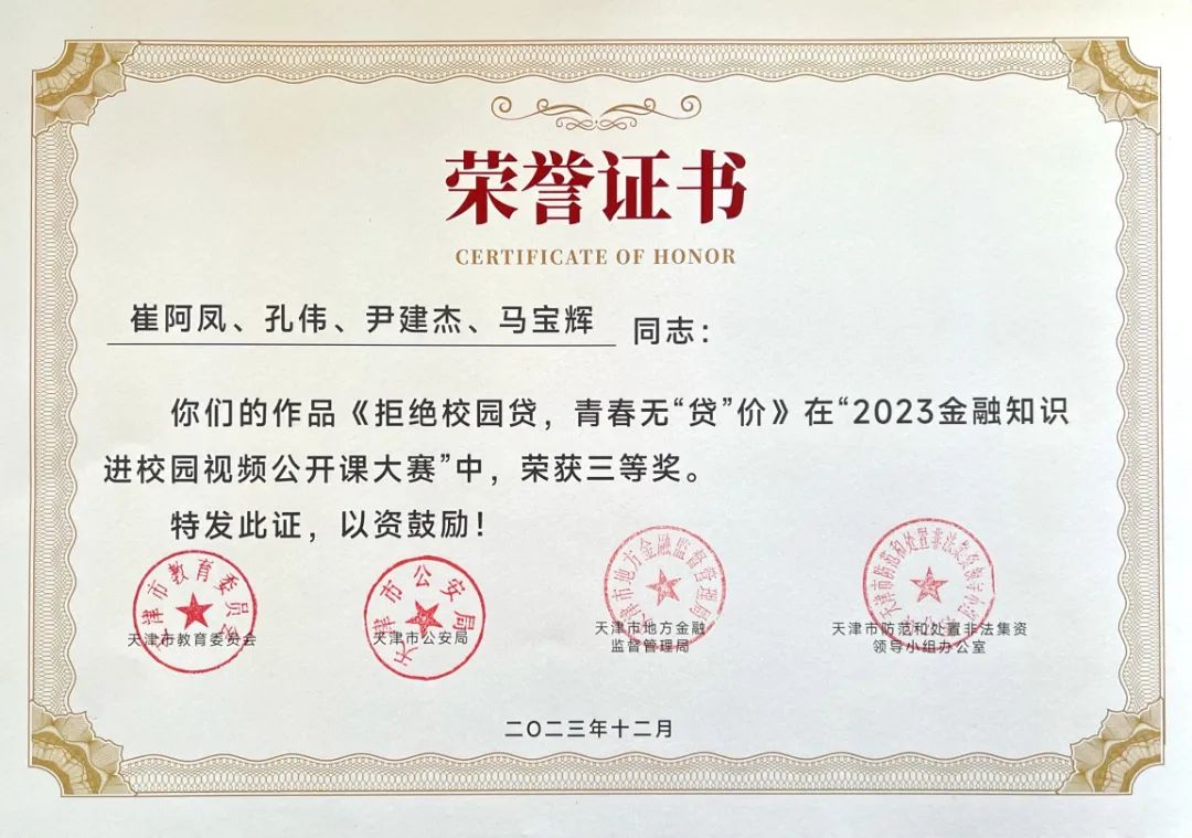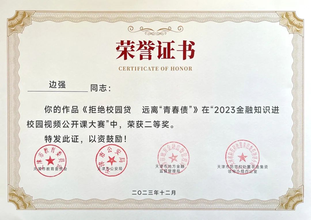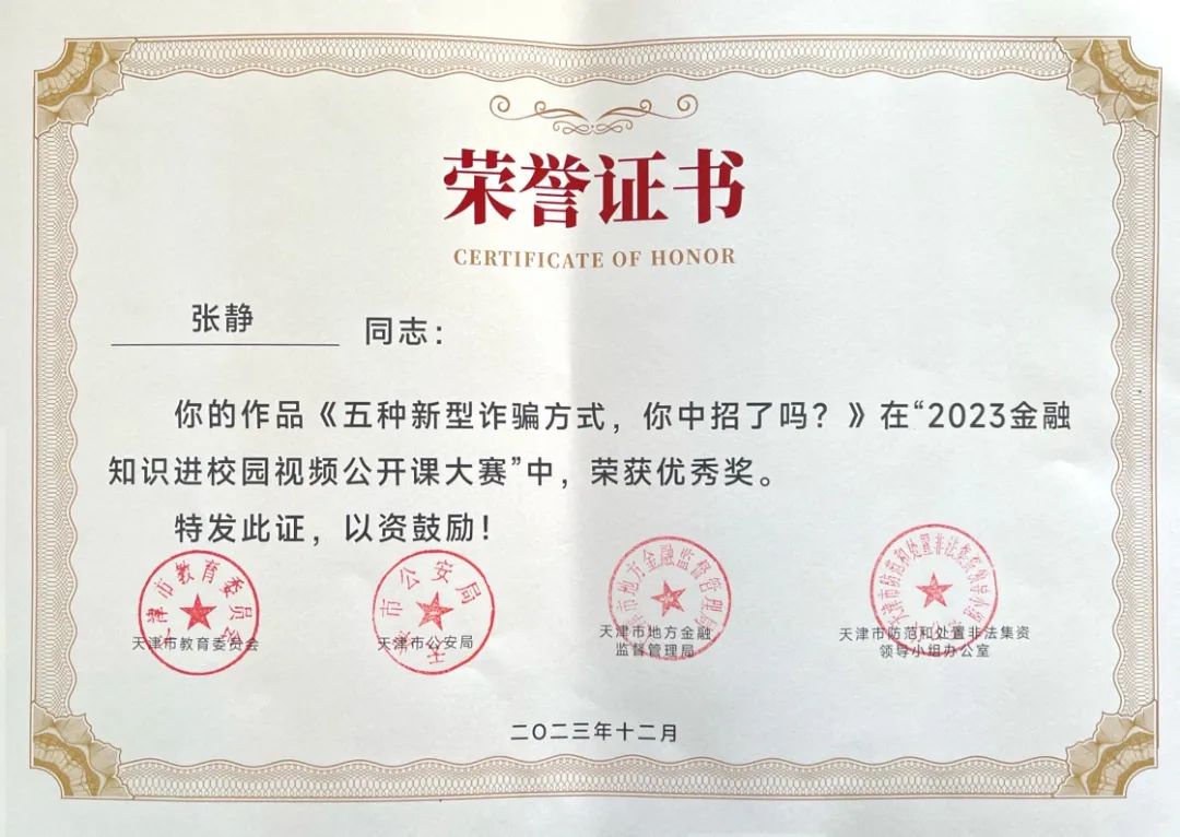 近日,市教育两委公布了2023年天津市教育系统国家安全重点课题调研获奖结果和天津市2023年金融知识进校园视频公开课大赛获奖结果。bv伟德1项课题,5幅作品纷纷获奖,学校被评为2023年金融知识进校园视频公开课大赛优秀组织单位。
