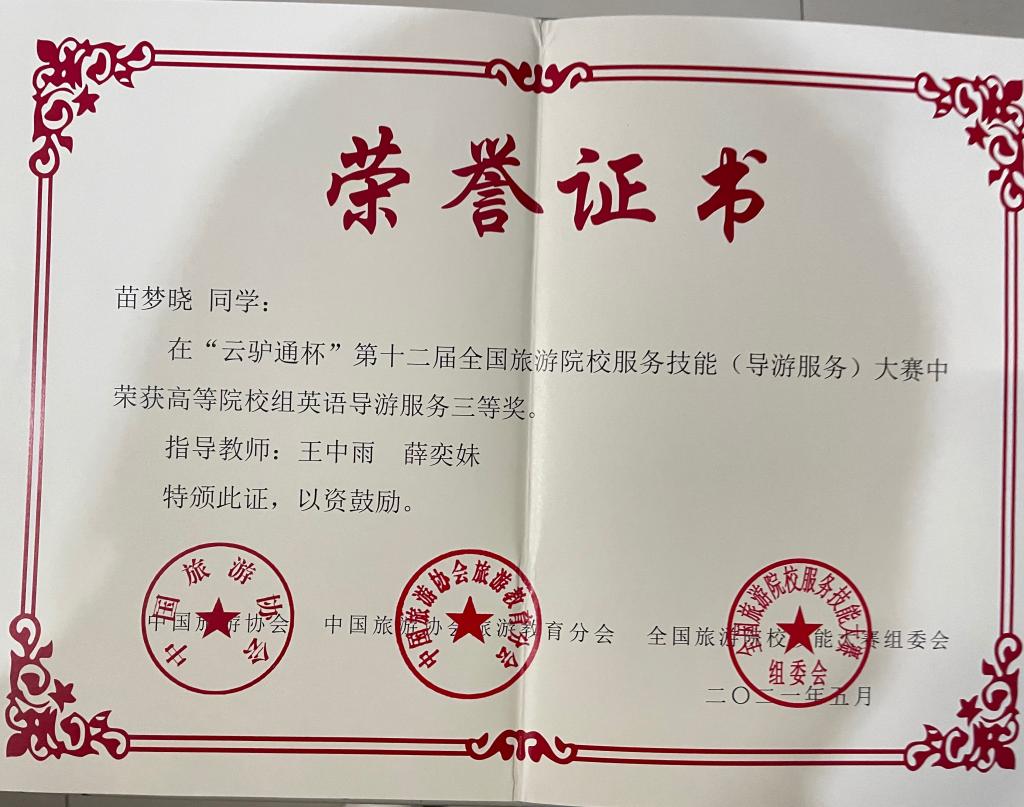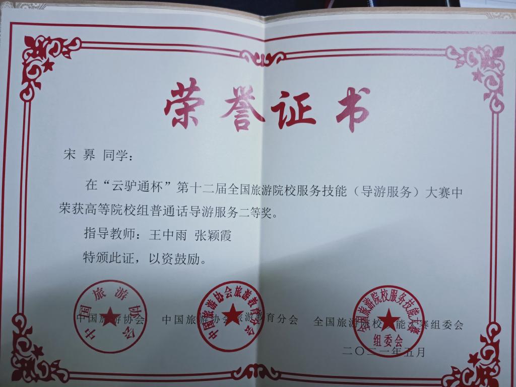 5月16日,“云驴通杯”第十二届全国旅游院校服务技能(导游服务)大赛在青岛酒店管理职业技术学校落下帷幕。欧冠官网派出3名参赛选手参加了高校普通话组和英语组的比赛。经过四天紧张而激烈的角逐,欧冠官网参赛选手成绩喜人,其中:宋奡获高校(普通话组)二等奖、刘梦云(普通话组)和苗梦晓(英语组)获三等奖的好成绩。