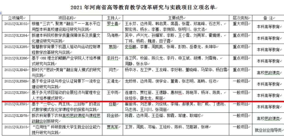 近日,河南省教育厅发布《关于公布2021年度河南省高等教育教学改革研究与实践立项项目的通知》(教高〔2022〕138号)》,欧冠官网王中雨副院长申报的《基于多元项目驱动的会展经济与管理专业人才培养模式研究》本科教育类项目成功获批。