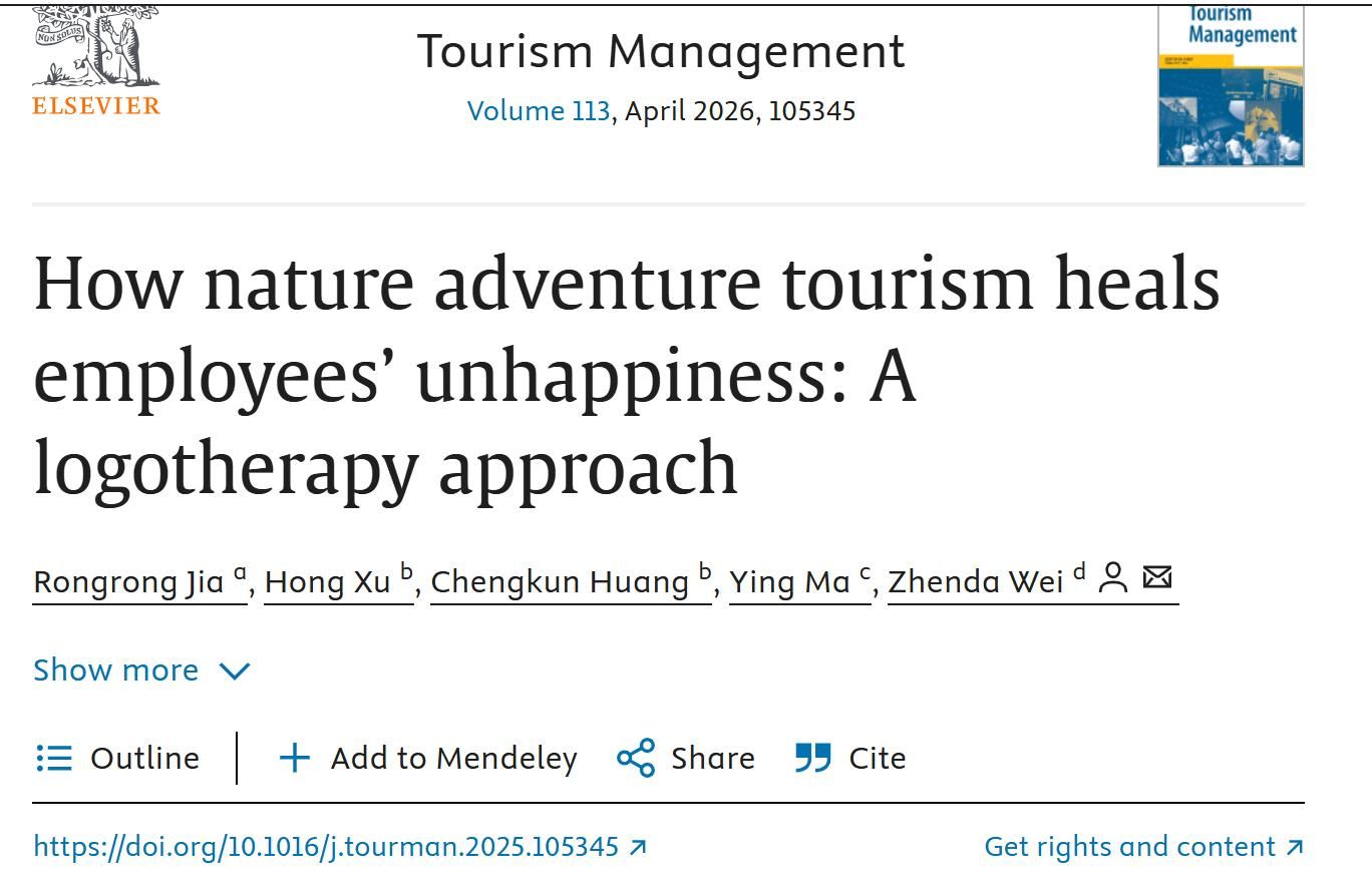 近日,旅游管理学科国际三大顶尖期刊之一的《Tourism Management》(影响因子IF=12.4, 引用指数CiteScore=26.5)接收并发表了欧冠官网贾榕榕老师作为第一作者、南开大学旅游与服务学院徐虹教授团队、聊城大学魏振达博士合作完成的研究成果《How nature adventure tourism heals employees’ unhappiness: A logotherapy approach》。