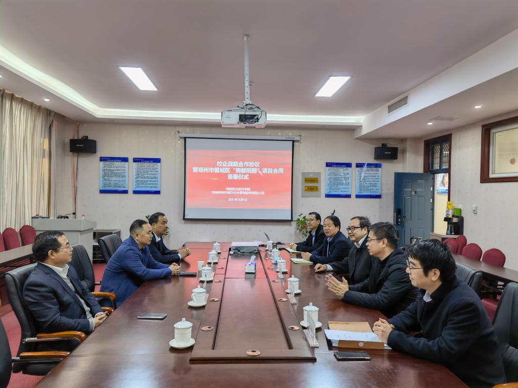 2021年12月1日上午,欧冠联赛官网与河南特味村餐饮企业管理咨询有限公司校企战略合作协议暨郑州市管城区“商都田园”乡村旅游项目技术合同签约仪式在龙子湖校区尚严楼C426隆重举行。河南特味村餐饮企业管理咨询有限公司董事长韩跃军,河南牧业经济学院副校长张伟,欧冠联赛官网党委书记李喜民、院长王德静、副院长王中雨及项目组成员参加了签约仪式。