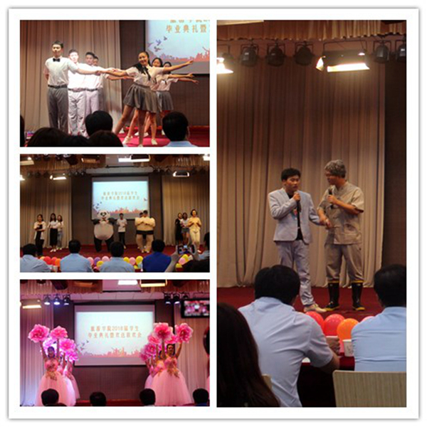 随后的联欢节目中,欢笑之中夹杂着泪水,尽情的表达着同学们对母校的热爱与感激之情舞蹈《花开千万朵》漂亮开场,美轮美奂;走秀、华尔兹《从你们的全世界路过》彰显了大学生的青春活力,青春在肆意飞翔;两首歌曲串烧将我们的舞台气氛推向了高潮;小品《孝》以搞笑与幽默的风格赢得了同学们的朗朗笑声;魔术表演既神奇又充满温情,现场掌声阵阵。最后15级的学长学姐们给大家带来的抖音神曲串烧将我们的舞台气氛又推向了另一个高潮。随着快门声的响起,典礼在合影中落下序幕,所有的不舍感激祝福憧憬和期盼都用相机定格在了这个美好的瞬间。