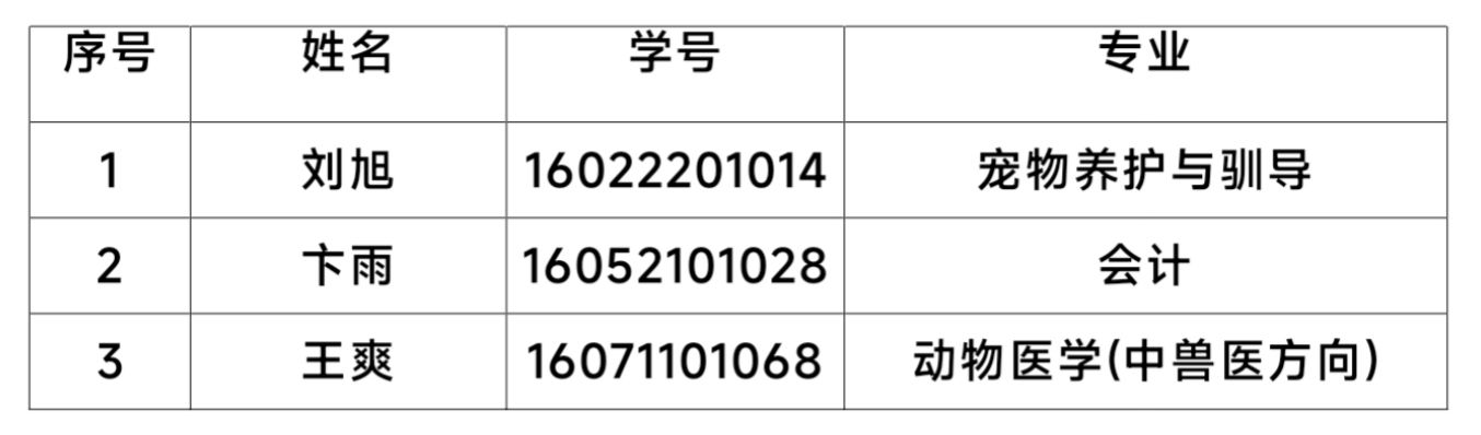 根据《普通高等学校学生管理规定》(教育部令第41号),按照《河南牧业经济学院学生管理规定》(校政〔2022〕94号)第四十四条第二款:“(二)休学、保留学籍期满,在学校规定期限内未提出复学申请或者申请复学经复查不合格的”可予退学处理,经校长办公会研究决定,给予刘旭等3名同学退学处理。