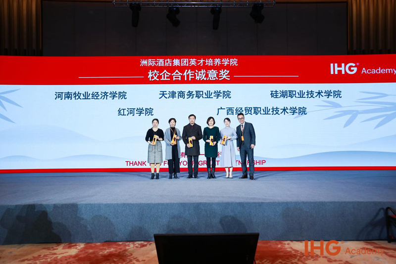 在此次大会上,学校被洲际集团授予校企合作诚意奖,酒店管理教研室主任上台领奖。