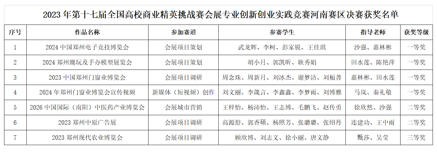 近日,第十七届全国高校商业精英挑战赛会展专业创新创业实践竞赛河南赛区发布竞赛结果,欧冠官网参赛团队均取得优异成绩,提交的14项参赛作品7项作品获奖,其中一等奖4项,二等奖2项,三等奖1项,6项作品顺利入围国赛(见附表)。
