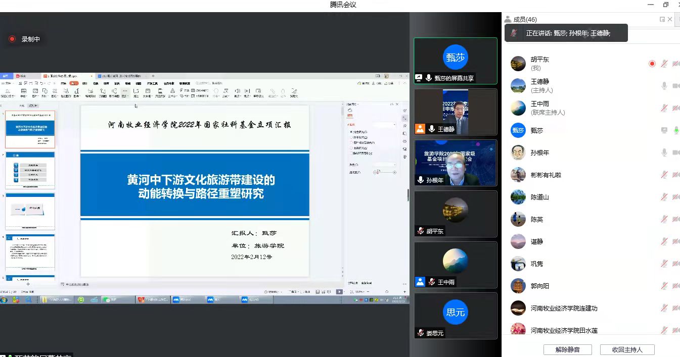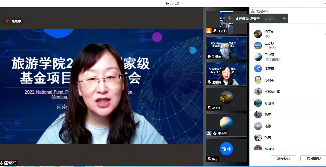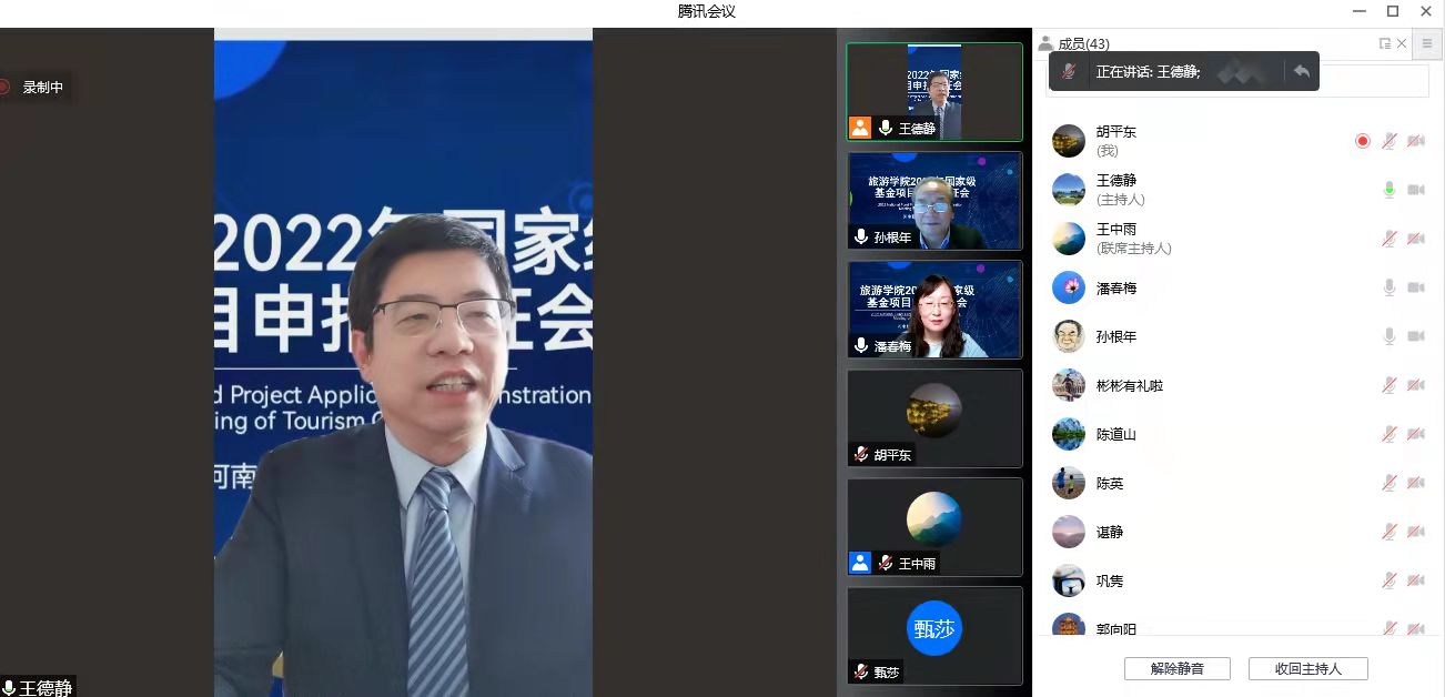 2022年2月12日上午,旅游学院通过腾讯会议成功召开了2022年度国家级基金项目申报论证会。本次论证会邀请到陕西师范大学旅游与地理科学学院旅游管理专业博士生导师孙根年教授担任评审专家。欧冠官网科学技术处处长潘春梅教授、副处长张红霞教授、社会科学管理科科长郭向阳老师,学院所有老师出席了会议。会议由王德静院长主持。
