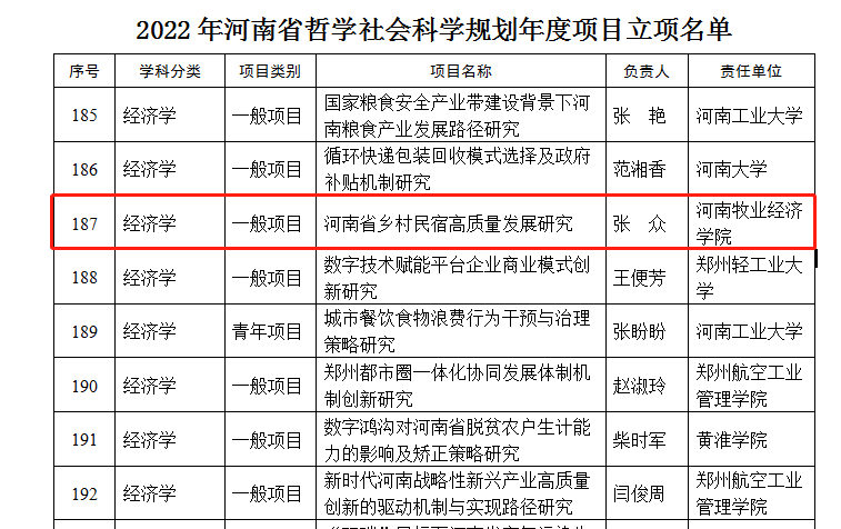 近日,河南省哲学社会科学规划办公室公布了2022年河南省哲学社会学科规划项目的立项名单。欧冠官网张众副教授的《河南省乡村民宿高质量发展问题研究》获准立项。该项目是欧冠官网“乡村民宿产业研究中心”成立以来,继《乡村振兴背景下的乡村民宿发展问题研究》(专著)获得2021年河南省社会科学优秀成果奖二等奖和河南省科技厅软科学重点项目《河南省乡村民宿发展模式研究》结项后的又一重要科研项目立项。