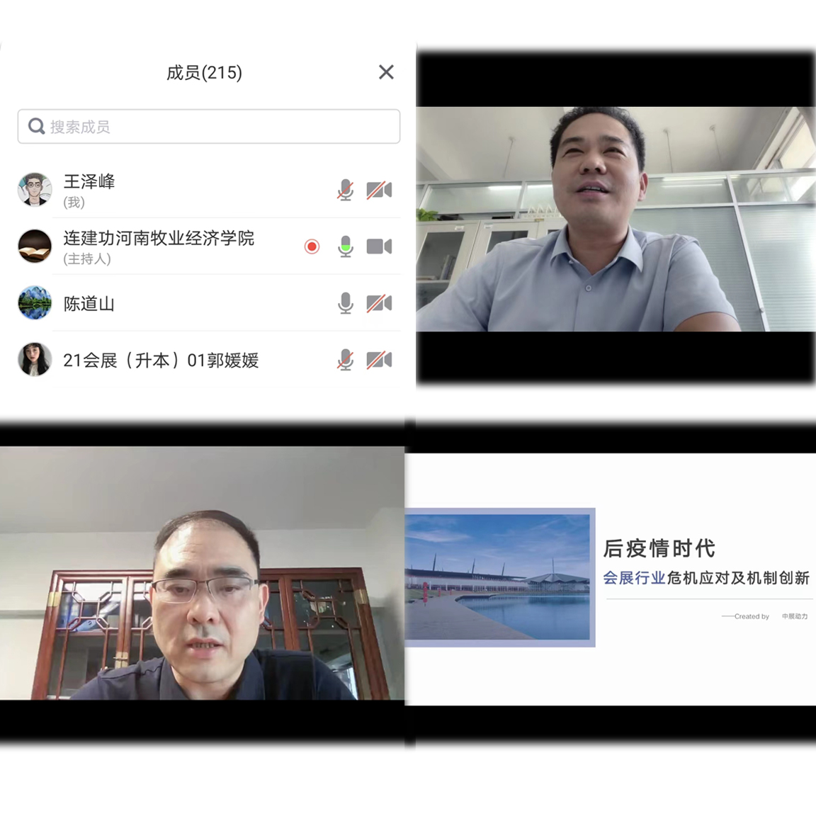 欧冠联赛官网邀请,河南中展动力展览有限公司总经理、郑州市会展行业协会副会长、河南牧业经济学院欧冠联赛官网专业指导委员会委员宋传强先生915下午为欧冠官网师生做了一场后疫情时代会展行业危机应对与机制创新”的线上讲座。欧冠联赛官网会展经济与管理教研室老师,21、22级会展专业学生认真聆听了讲座,讲座由学院副院长陈道山主持。