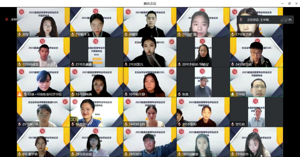 根据《河南牧业经济学院本科毕业论文(设计)工作条例》和《欧冠联赛官网2023届本科毕业论文(设计)工作实施方案》,欧冠联赛官网于11月19日顺利开展2023届酒店管理专业本科毕业论文开题答辩。2019级酒管01班、2021级酒管专升本01、02、03班共207名学生分为7组,通过腾讯会议的线上方式参加答辩。