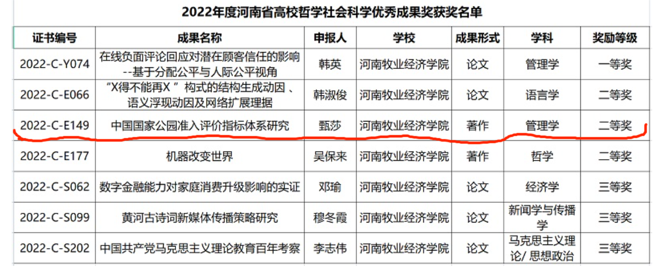 近日,河南省教育厅公布了2022年度河南省高等学校哲学社会科学研究成果奖评选结果,欧冠官网甄莎博士的《中国国家公园准入评价指标体系研究》著作荣获二等奖。《中国国家公园准入评价指标体系研究》是河南省新闻出版局2022年省部级重点立项项目,由郑州大学出版社出版。