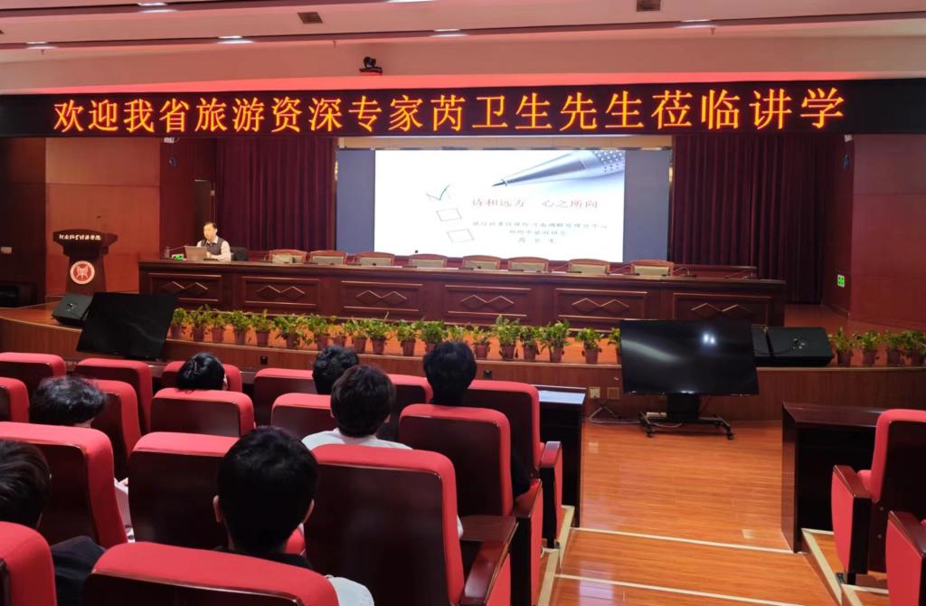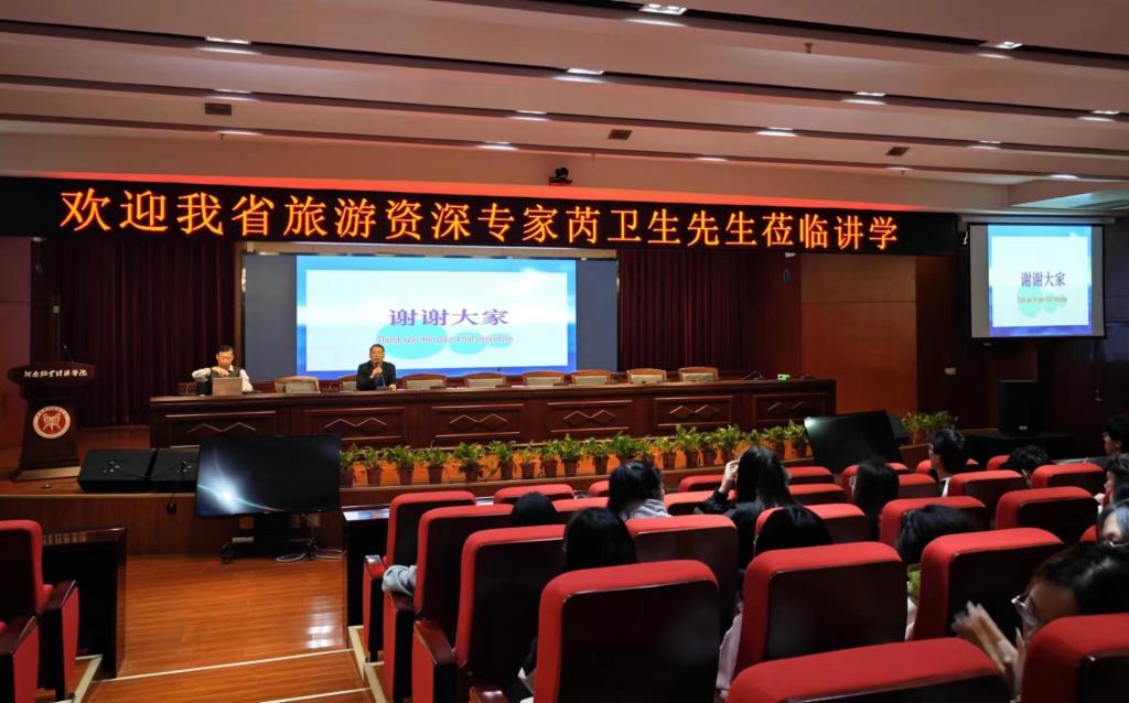 讲座伊始,芮主任就如何让文旅融合,诗与远方“牵手”前行展开讲解,他指出文化是旅游的灵魂,旅游是文化的载体,坚持以文塑旅,以旅彰文,推进文化和旅游深度融合发展。旅游要发展,服务是关键,用心服务,才能温暖旅途,照亮旅游产业的前景。紧接着芮主任提出旅游文明与公民道德之间的关系,让文明旅游深入人心,成为公民旅游行为的标尺。最后他向师生详细阐述了自己的工作重心,他指出安全是旅游的生命线,旅行社对于游客人身财产安全是第一责任人,是游客安全保障义务的最有力的执行者和保障者,同时游客自己要具备安全意识。芮主任建议学院多进行旅游安全教育,培养学生安全意识,适当在课程中融入安全知识,对学生今后职业工作中的安全素养起到引领作用。