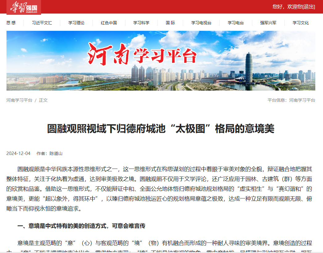 12月4日,“学习强国”河南学习平台发表了欧冠联赛官网副院长陈道山的署名文章——《圆融观照视域下归德府城池“太极图”格局的意境美》。