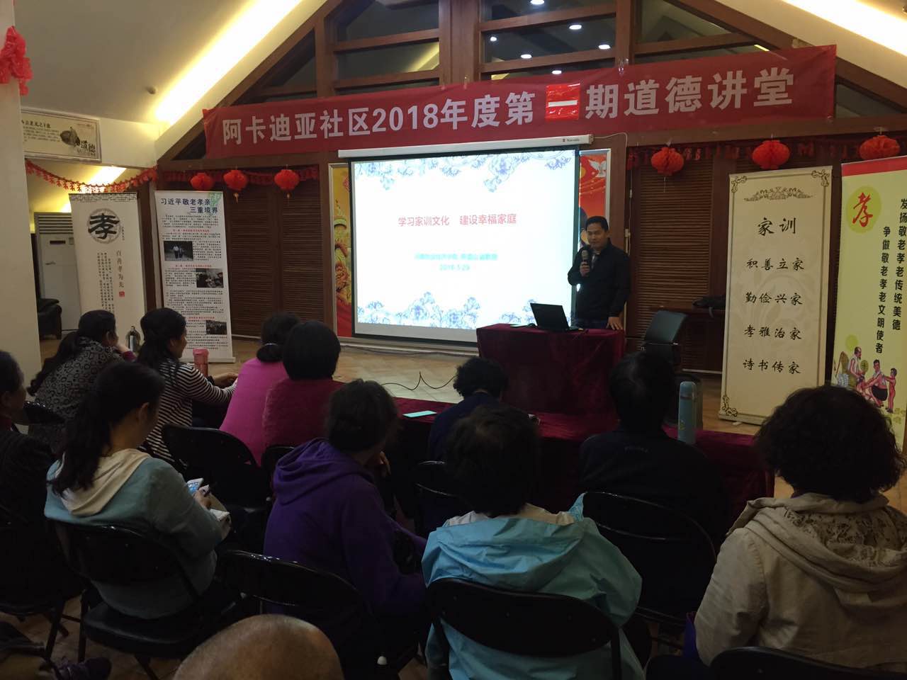 为了弘扬优秀民族传统文化,践行社会主义核心价值观,根据学校“学习贯彻十九大 文明单位社区行”活动计划2018年3月29日下午,欧冠联赛官网组织老师走进阿卡迪亚社区,以“家风家教”为主题,为社区居民带去了一场精神盛宴。