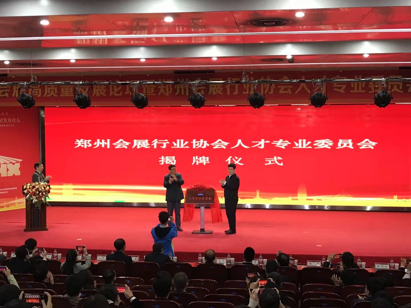 河南财经政法大学副校长刘荣增致欢迎词,河南省商务厅二级巡视员王苏、河南省政协经济委员会主任孙新雷、郑州会展行业协会常务副会长谢军、郑州会展行业促进中心副主任王亚平、郑州会展行业协会人才专委会主任赵现红先后致辞发言。大家一致认为人才对会展业发展的重要意义,郑州市会展行业协会人才专委会的成立为郑州乃至河南会展业人才建设提供了思路。大会为郑州会展行业协会人才专业委员会举行了揭牌仪式,河南牧业经济学院欧冠联赛官网当选人才专业委员会副主任单位。