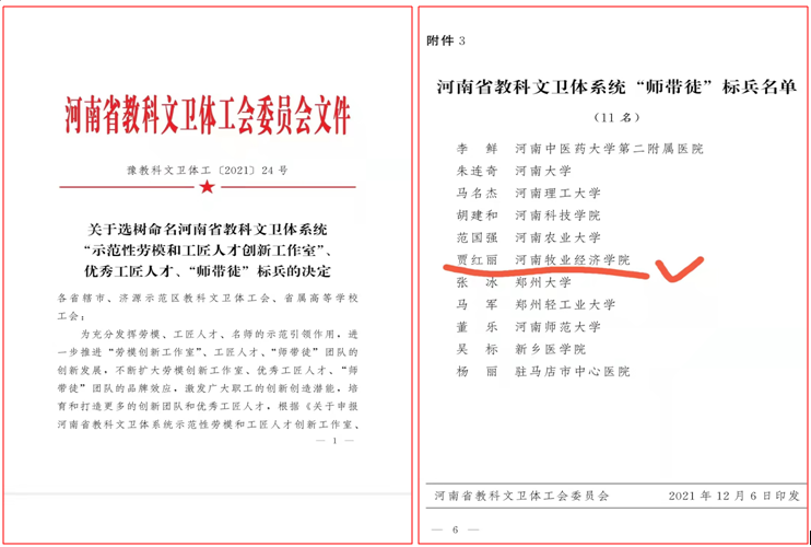 近日,从河南省教科文卫体工会传来喜讯,欧冠官网贾红丽老师荣获2021年河南省教科文卫体系统示范性“师带徒”标兵荣誉称号,此项殊荣全省仅有11对。